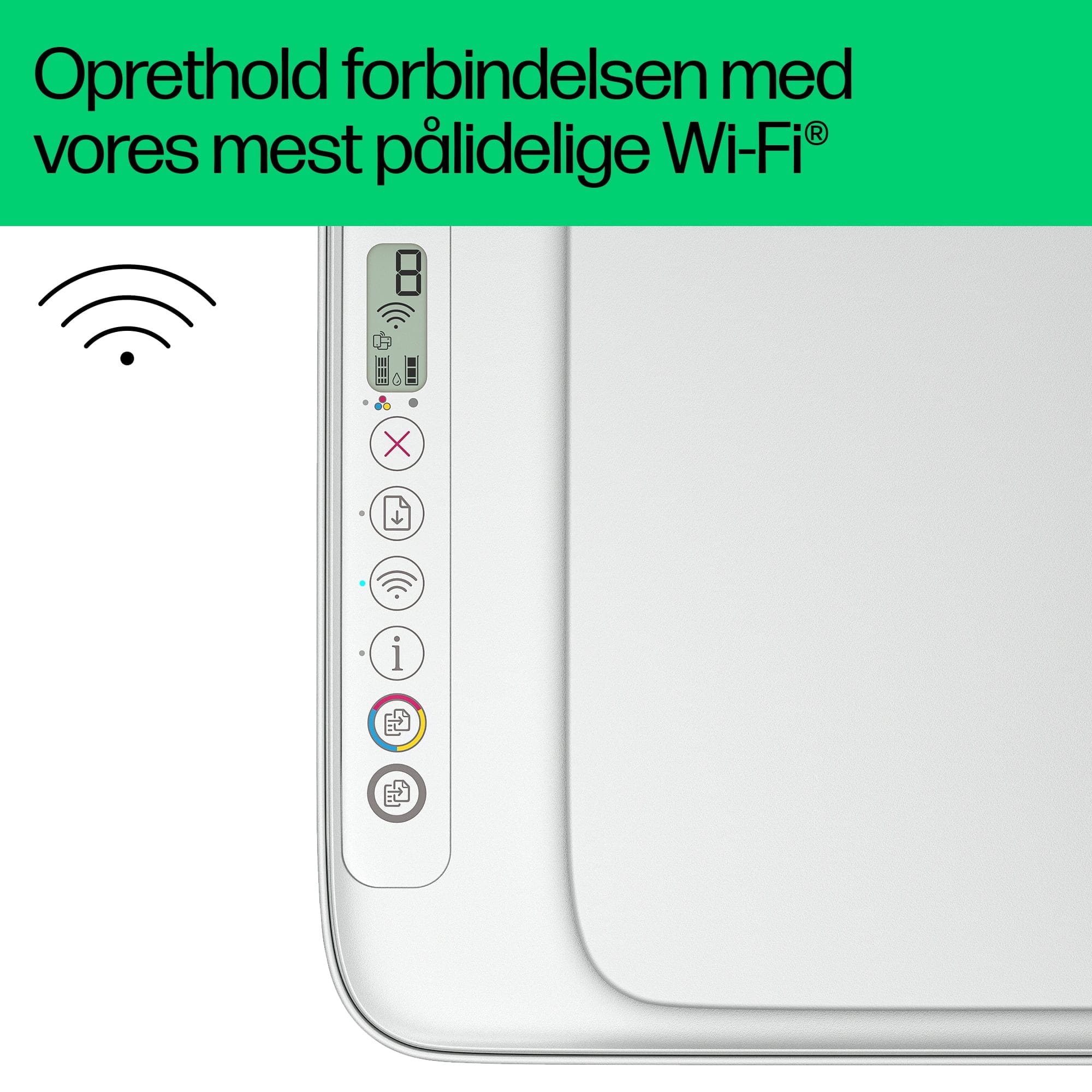 Vælg HP+ i forbindelse med opsætning for at få aktivere fordelene. HP+ kræver en HP-konto, fast internetforbindelse og eksklusiv brug af originale HP-blækpatroner i hele printerens levetid. Flere oplysninger på: http://www.hp.com/plus